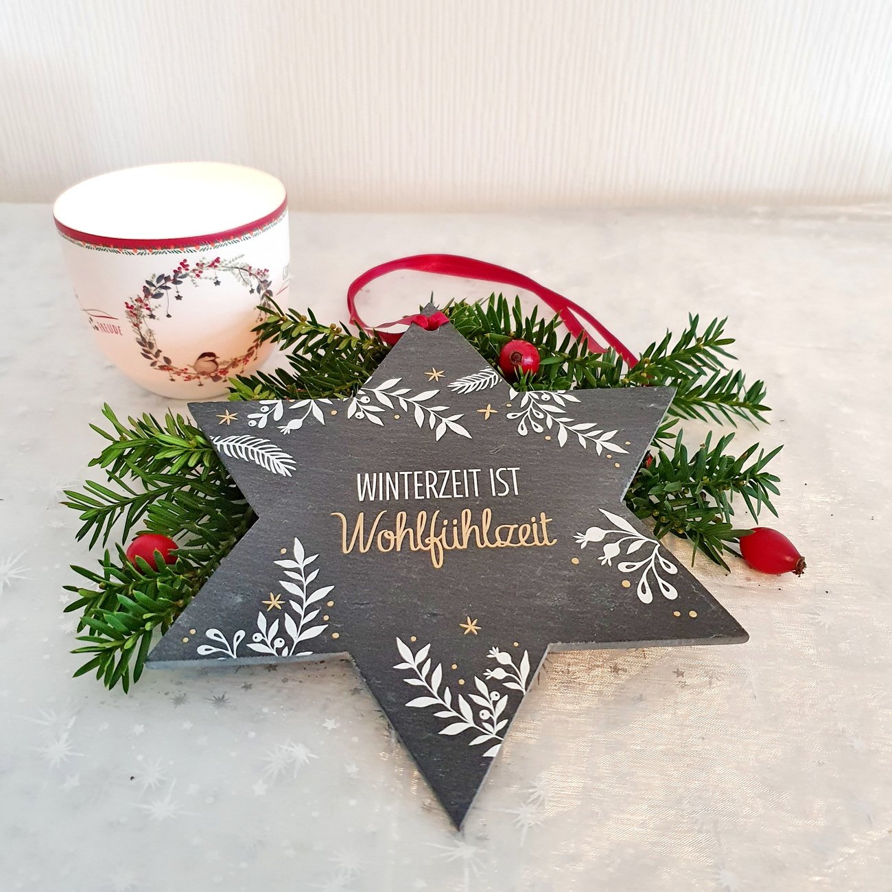 Dekoratives Schieferrelief in Sternform mit Aufhängeband – ideal als Türschild oder Wanddeko. Mit dem Spruch „Winterzeit ist Wohlfühlzeit“ für eine gemütliche Winterstimmung.